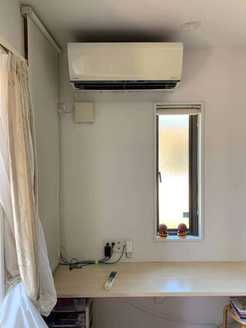 最近では、お掃除機能付きエアコンを設置されているお宅が多いです。こちらの施工写真にご協力いただきましたお客様のエアコンも日立のお掃除付きエアコンです。2013年製のエアコンです。